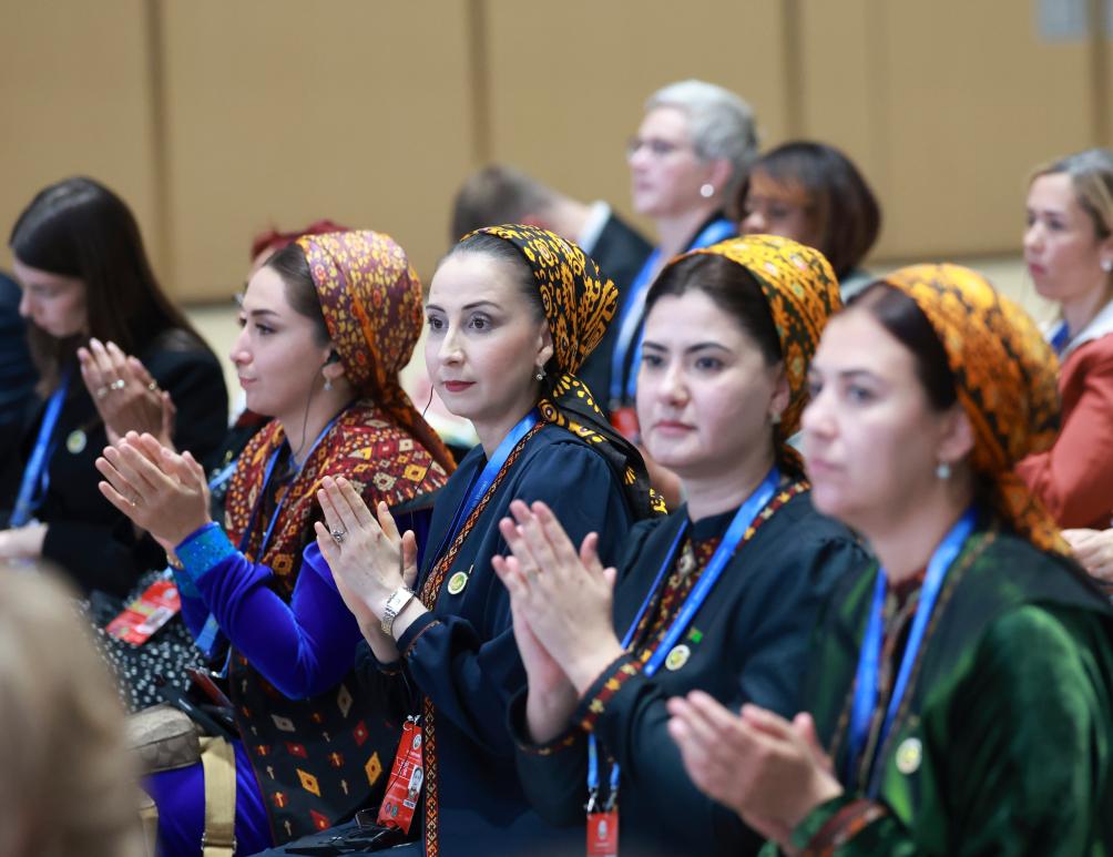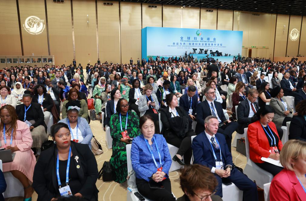 国家会议中心,不同肤色、语言和文化交融。全体会议会场外,“华韵承芳·非遗共赏”女性主题特展前,各国代表流连于精美中式作品间,感受东方文明之美;会场内,穹顶灯光如星河倾泻,精彩发言引发共情共鸣,掌声阵阵。