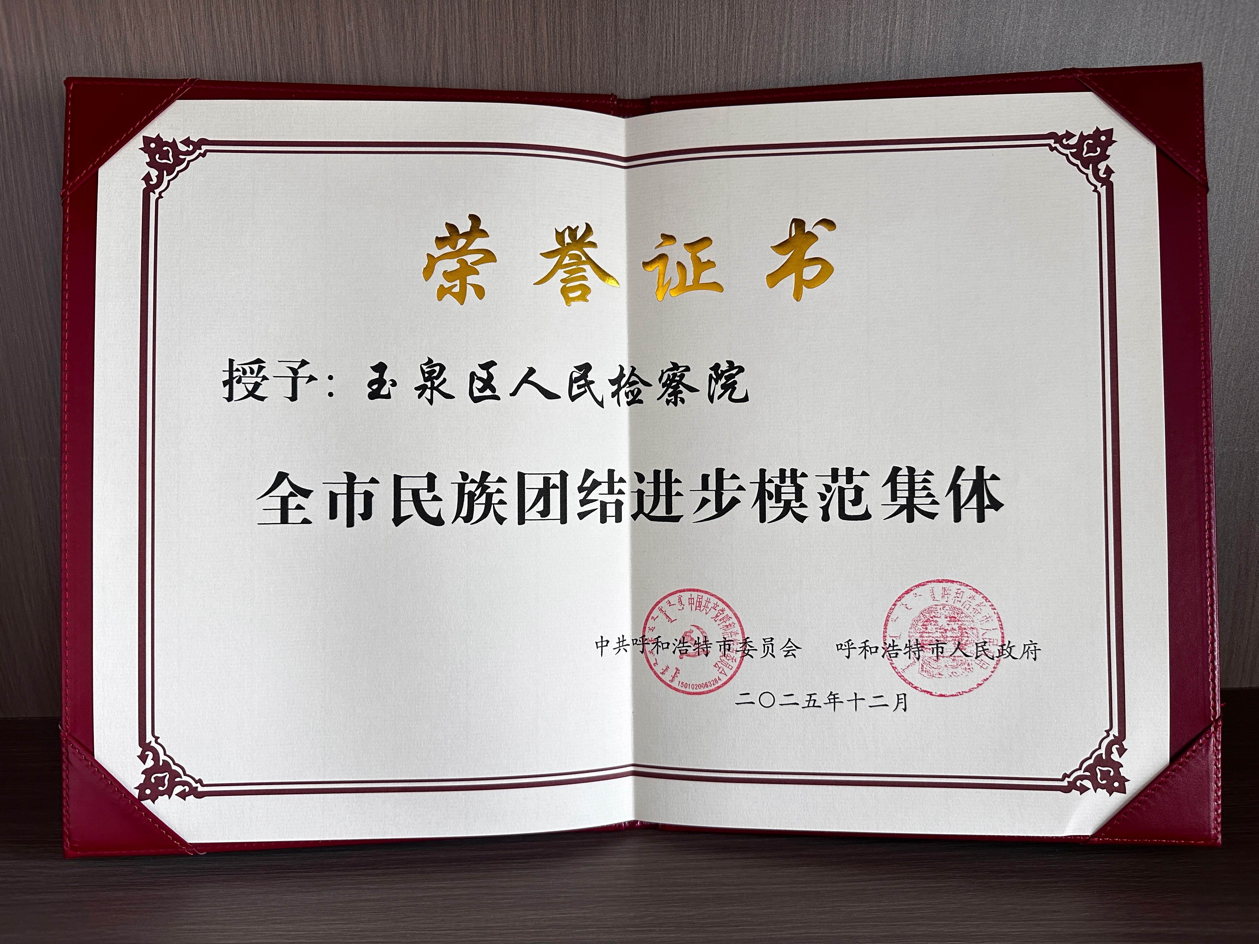 2025年12月18日,在呼和浩特市第十三次民族团结进步表彰大会上,玉泉区人民检察院凭借在法治保障、民生服务、文化传承等方面取得的突出实绩,被授予“呼和浩特市民族团结进步模范集体”这一荣誉称号!作为全市检察系统中唯一入选的单位,这一殊荣不仅是对我院长期以来立足检察职能、深耕民族团结沃土的高度认可,更是对全体检察人员牢记嘱托、践行使命的莫大鼓舞!