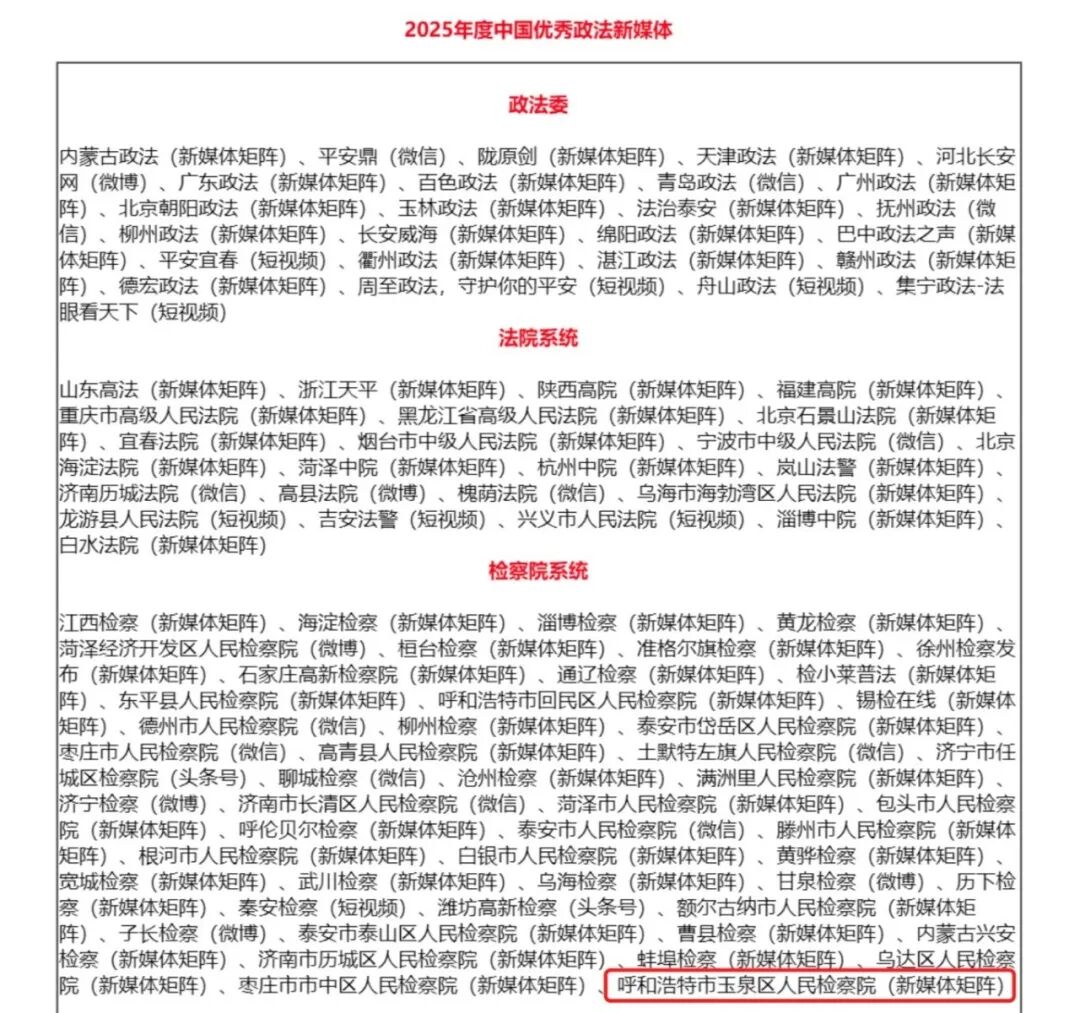 北疆有“检”力,传播有新意!呼和浩特市玉泉区人民检察院新媒体矩阵强势上榜“2025年度中国优秀政法新媒体”,这份国字号荣誉藏着怎样的圈粉密码?今天就来解锁这份“有温度、接地气”的法治传播答卷~