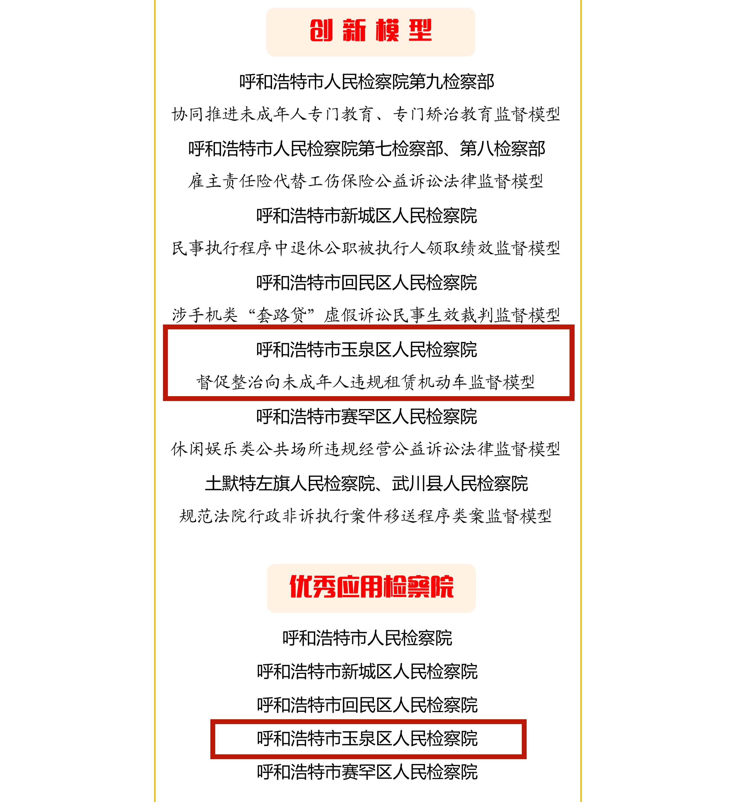 近日,内蒙古自治区检察院公布了2025年全区检察机关大数据法律监督模型应用结果,我院荣获多项荣誉,“呼和浩特市玉泉区人民检察院督促整治向未成年人违规租赁机动车监督模型”荣获创新模型、呼和浩特市玉泉区人民检察院荣获优秀应用检察院。