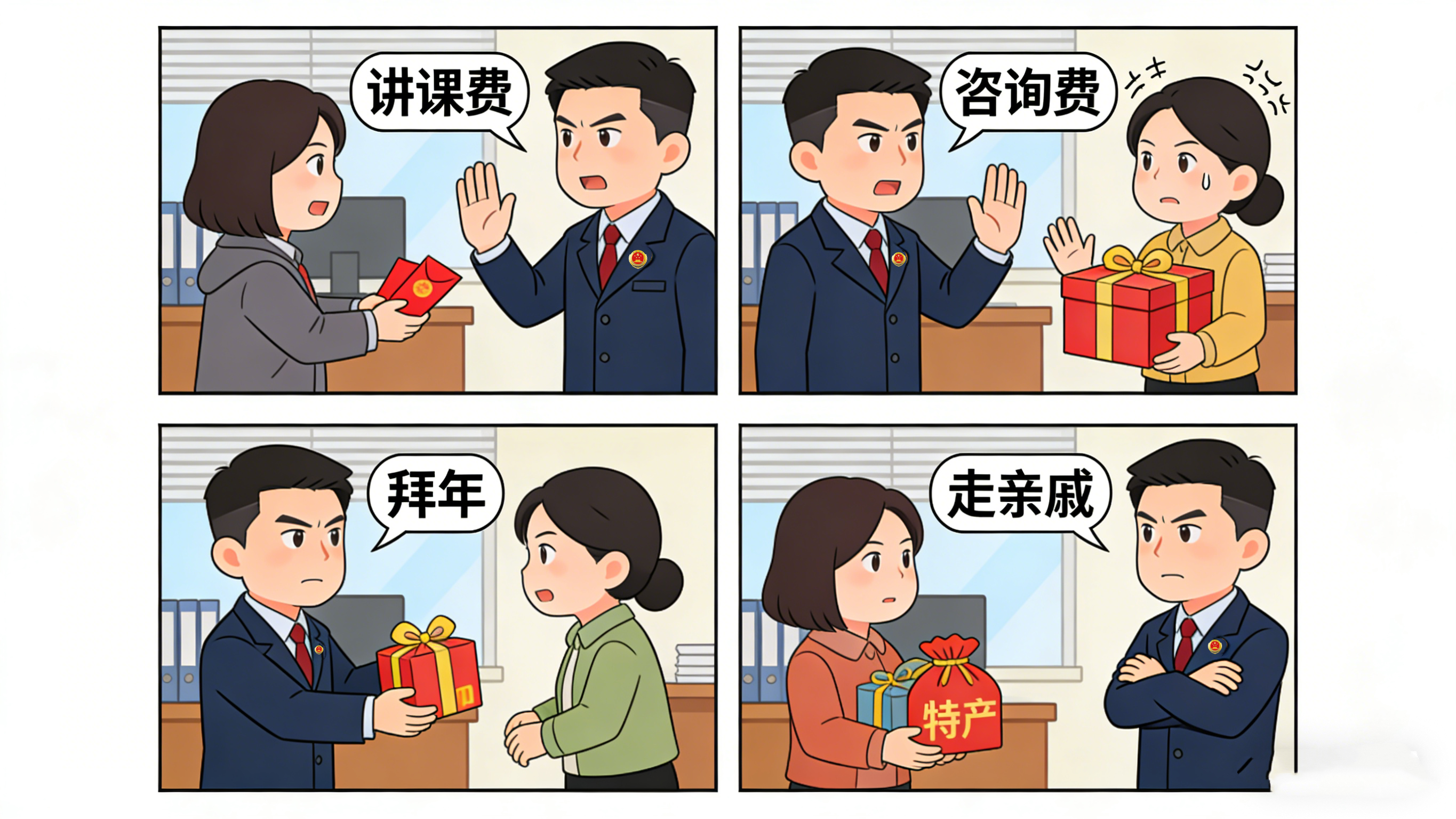 ?别收!管理服务对象、案件相关人员的红包、购物卡、提货券,哪怕是微信小红包、电子礼品卡,再小也不能要,“隔空送礼”也不行;名贵特产、烟酒茶、保健品,看似普通,实则藏着“猫腻”,坚决拒收不能手软!