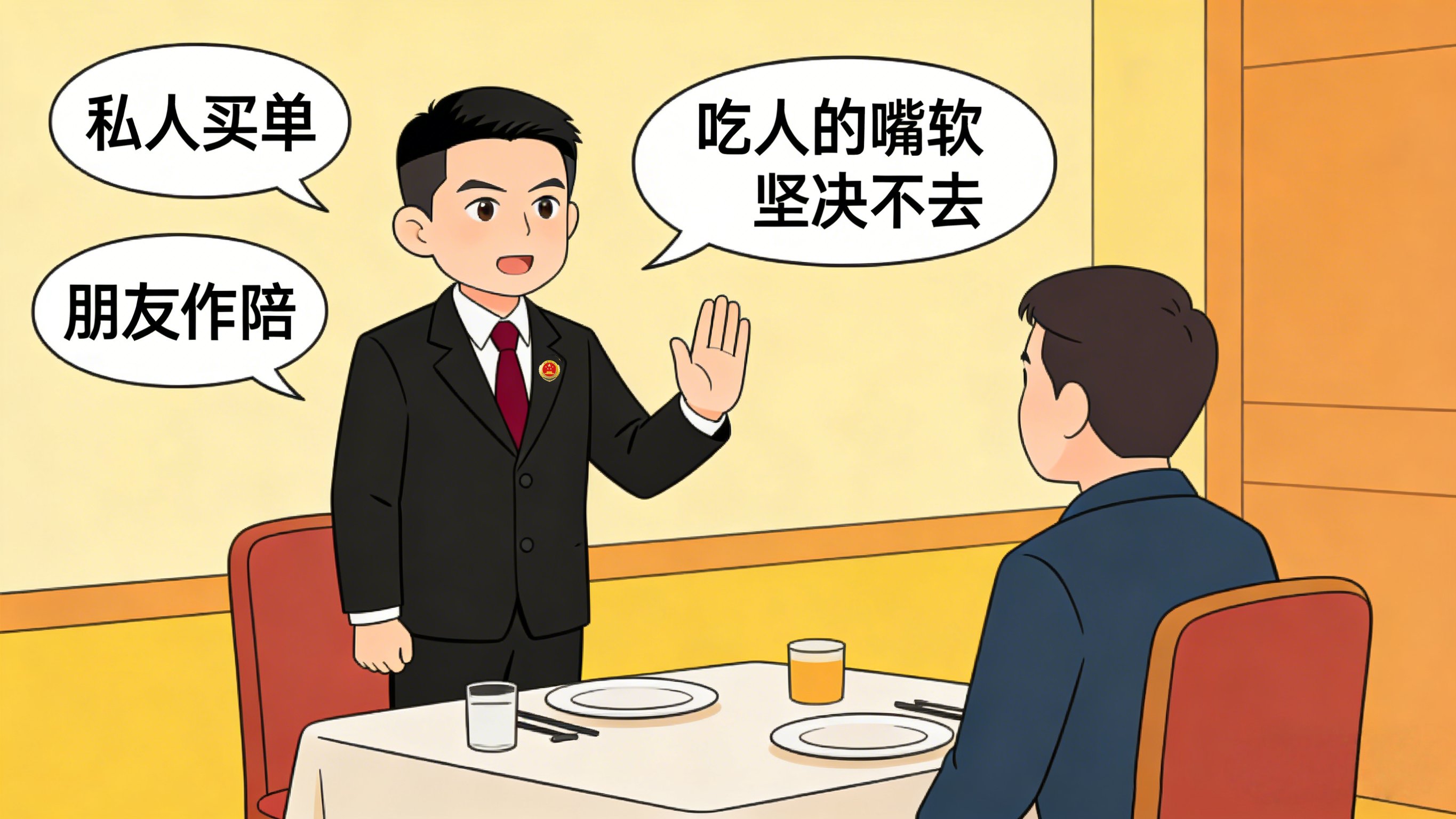 ?不参加!管理服务对象、案件当事人安排的宴请,哪怕是“私人买单”“朋友作陪”,也坚决不去,避免“吃人的嘴软”;