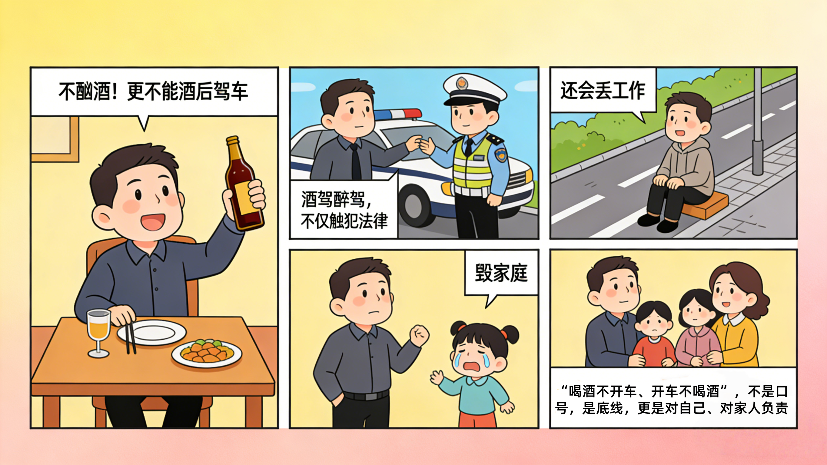 ?不酗酒!更不能酒后驾车——酒驾醉驾,不仅触犯法律,还会丢工作、毁家庭,“喝酒不开车、开车不喝酒”,不是口号,是底线,更是对自己、对家人负责;