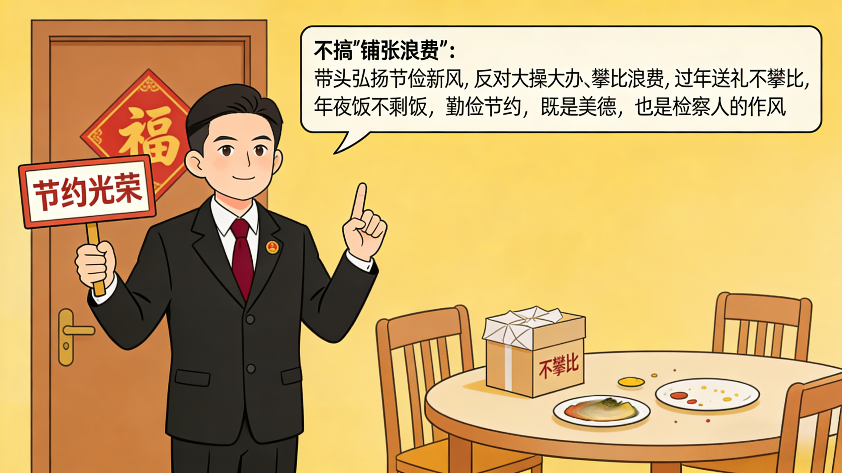 ?不搞“铺张浪费”:带头弘扬节俭新风,反对大操大办、攀比浪费,过年送礼不攀比,年夜饭不剩饭,勤俭节约,既是美德,也是检察人的作风;