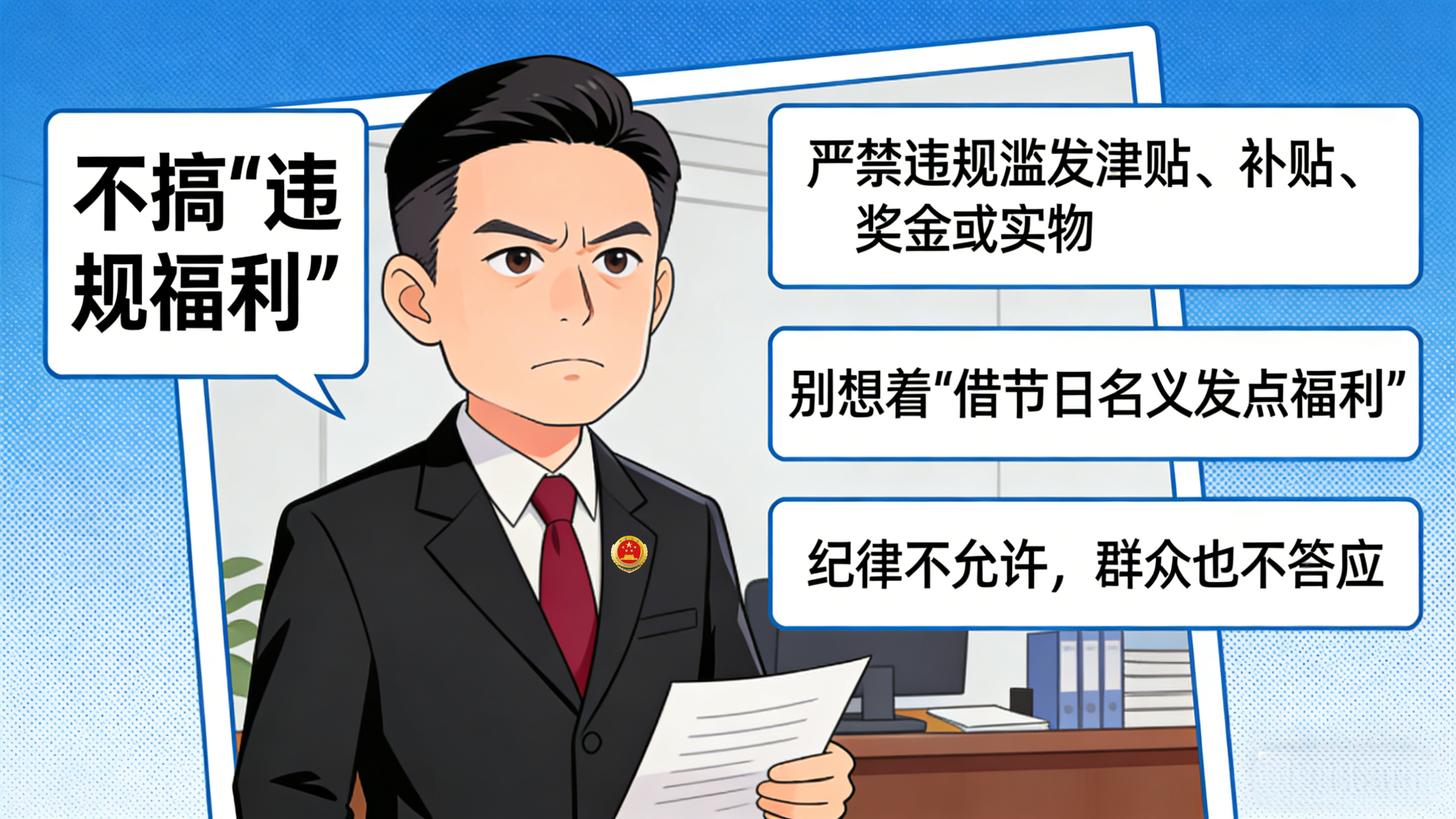 ?不搞“违规福利”:严禁违规滥发津贴、补贴、奖金或实物,别想着“借节日名义发点福利”,纪律不允许,群众也不答应;