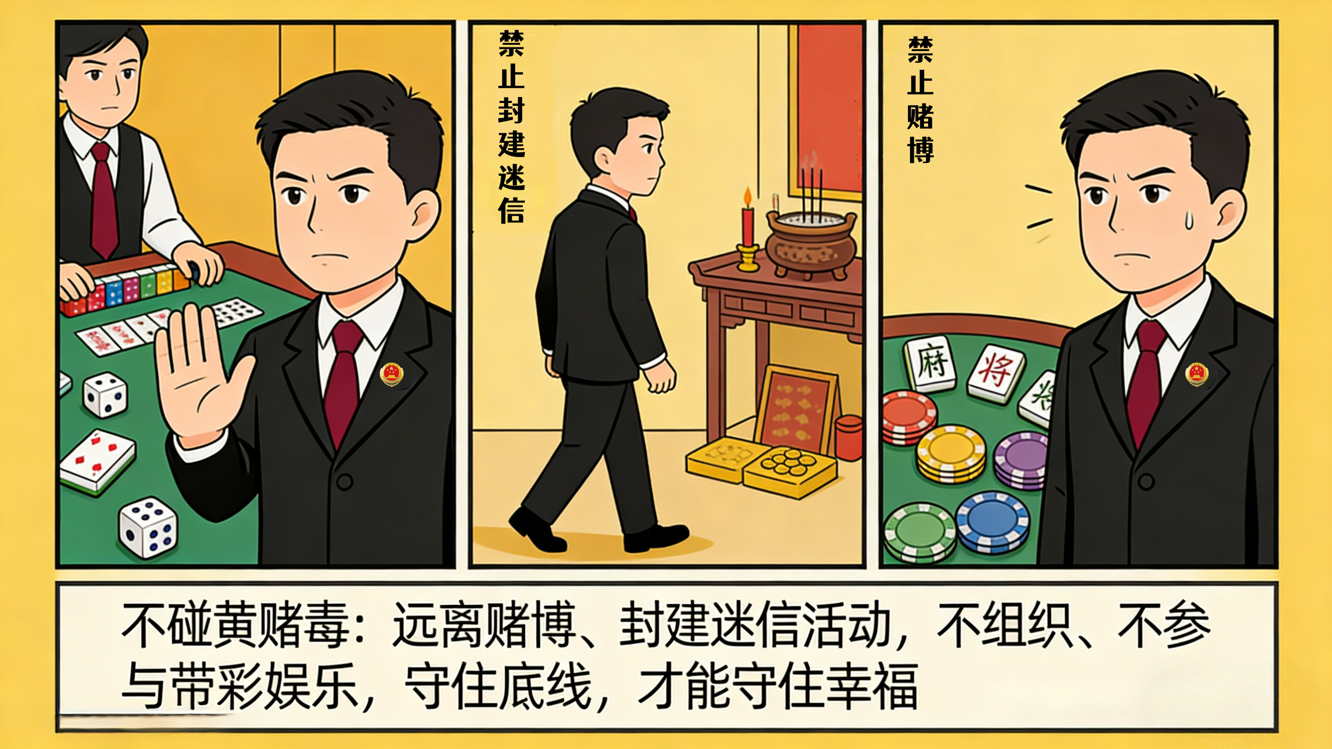 ?不碰“黄赌毒”:远离赌博、封建迷信活动,不组织、不参与“带彩”娱乐,守住底线,才能守住幸福;
