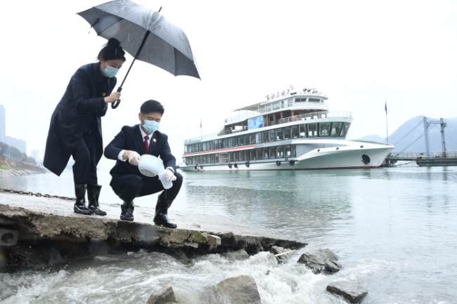湖北省宜昌市伍家岗区检察院收到“益心为公”志愿者反映的河道排污线索后,3月16日,该院公益诉讼检察部门检察官赶赴现场,对江岸正在排放的污水进行了多点位采样取证,并对现场环境拍照固定证据。本报全媒体记者蒋长顺 通讯员焦雯雯 王忠摄