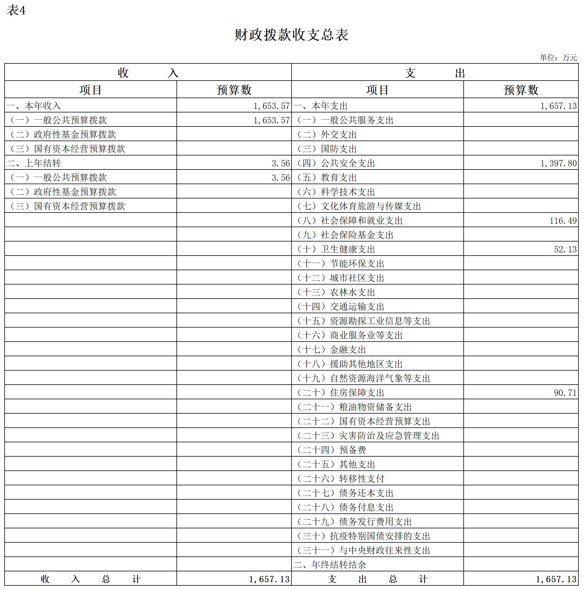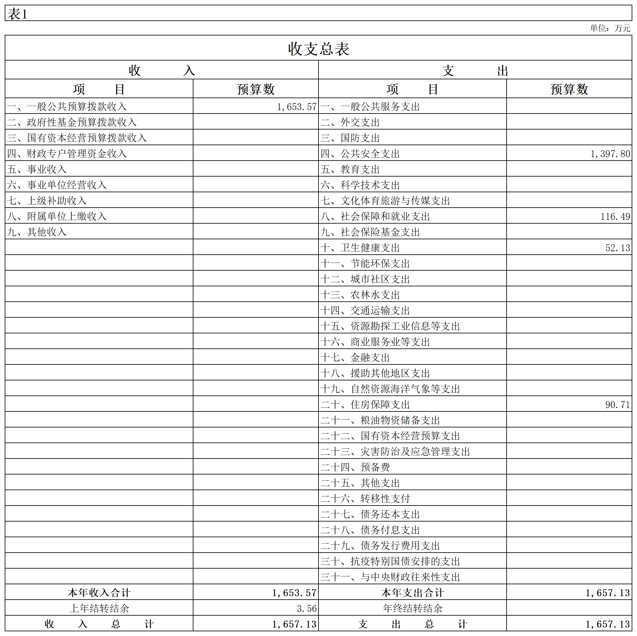 部门预算收入1657.13万元,其中:一般公共预算拨款本年收入1653.57万元,占比99.79%;上年结转3.56万元,占比0.21%;政府性基金预算拨款收入0万元,占比0%;事业收入0万元,占比0%;事业单位经营收入0万元,占比0%;其他收入0万元,占比0%;上年结转0万元,占比0%,用事业基金弥补的收支差额0万元,占比0%。